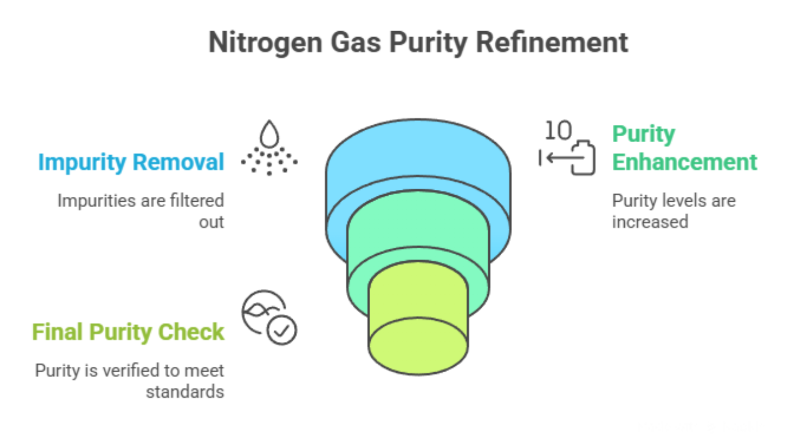Here’s where the magic happens: The Nitrogen, already boasting an exceptional 99.9% purity, undergoes a meticulous purification process. It is meticulously passed through a specially designed tower filled with a top-grade Copper catalyst, while being subjected to a precisely controlled temperature of 180 degrees Celsius. This ingenious process works wonders, reducing the oxygen content from a mere 0.1% to virtually negligible PPM levels.