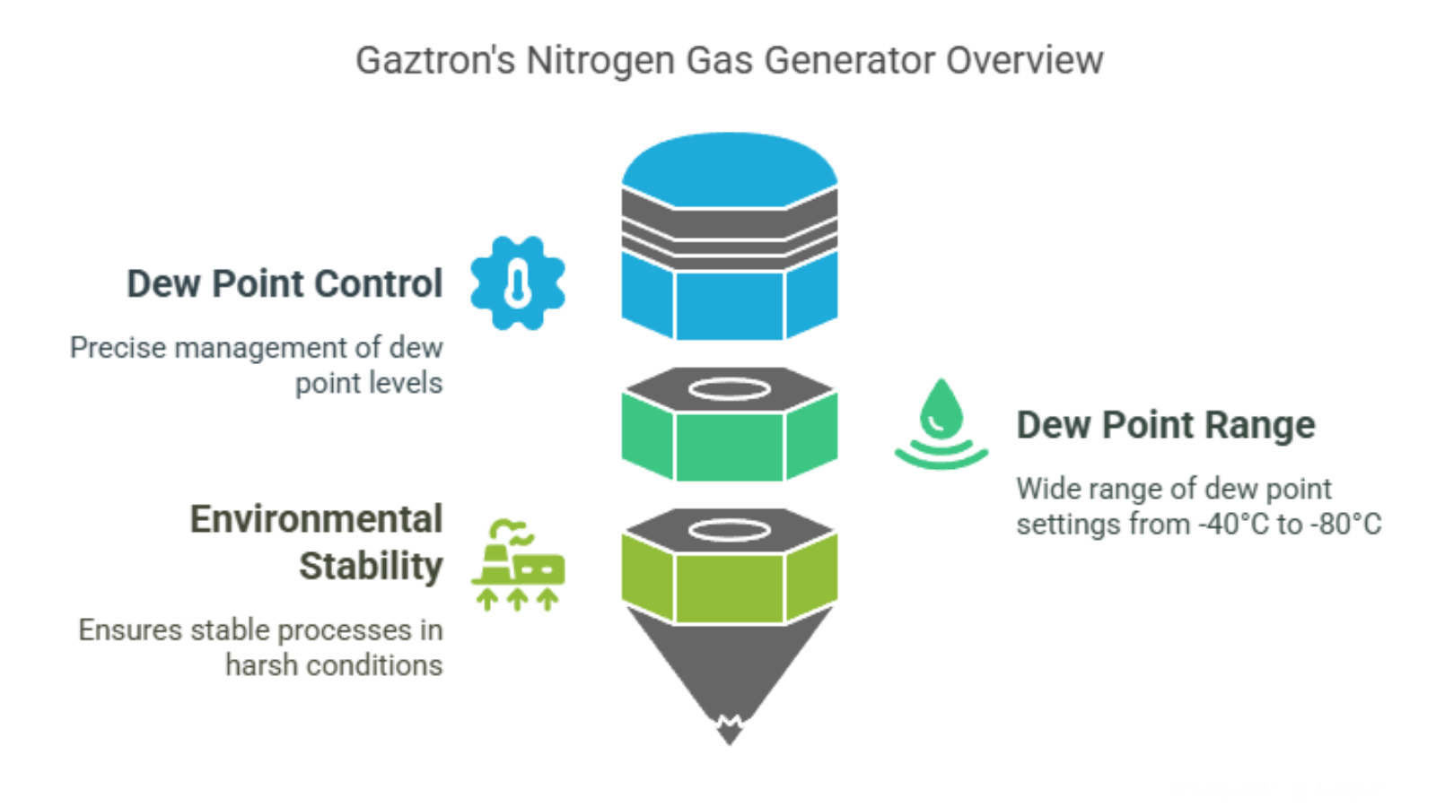 With Gaztron's nitrogen gas generator, you gain precise control over the dew point of nitrogen gas. Witness the dew point range from -40 degrees centigrade to an impressive -80 degrees centigrade, ensuring your processes remain stable even in the harshest environments.