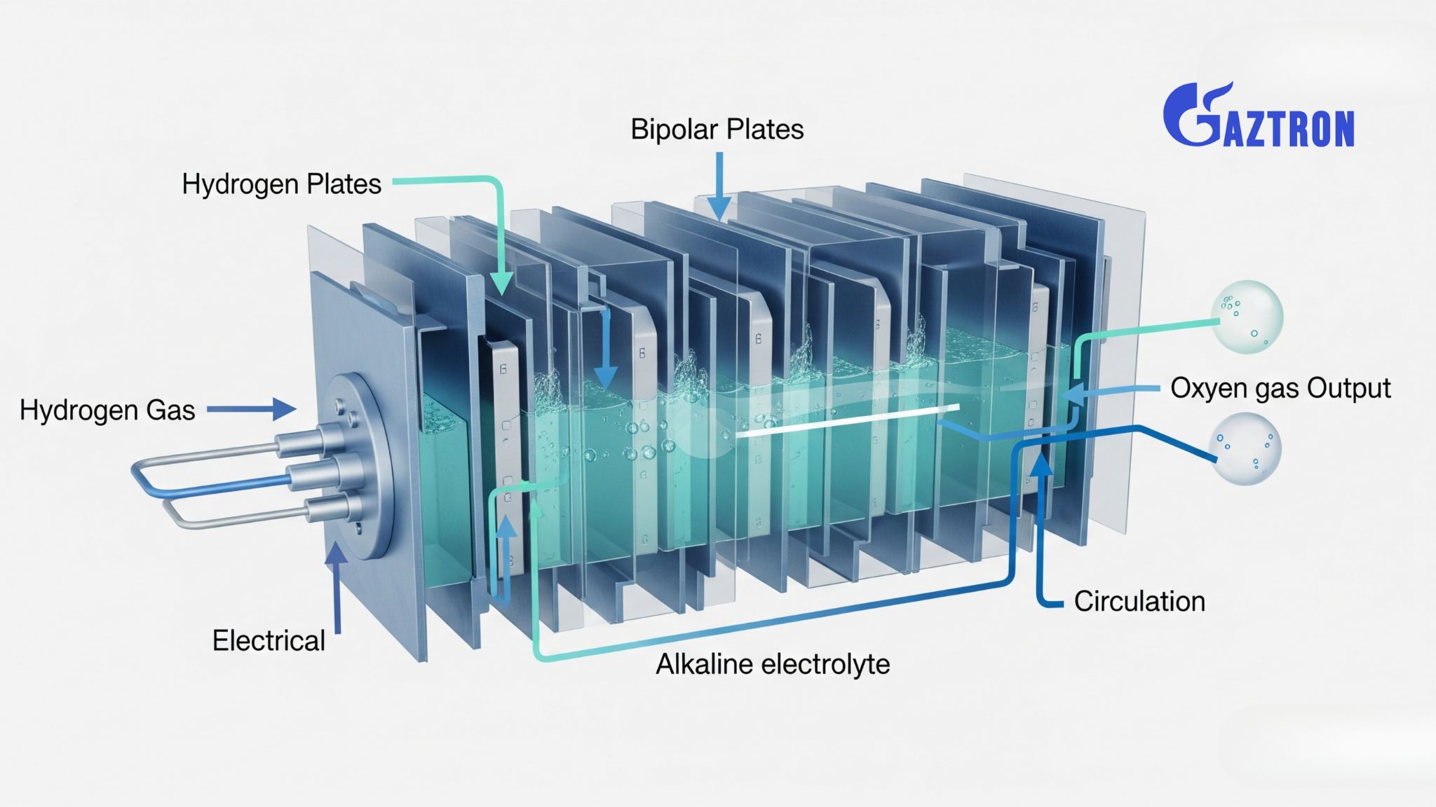 Our Electrolyzer features a Bipolar design, in which high purity DM water is split into H2 and O2 using DC power from a rectifier. Hydrogen is generated at the cathode side of the cells, while oxygen is produced at the anode side. This unique design results in a compact Electrolyzer unit that can produce gases at high pressure (15 Bar) directly, eliminating the need for a separate Hydrogen compressor for medium pressure Hydrogen requirements.